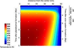 Additionally, their model showed that while the inner regions of the asteroid were warm enough to have liquid water 0.3 million years after formation, the exterior regions remained cool for a further 0.3–1.0 million years. This explains how dissimilar meteorites could arise from the same asteroid; the Jbilet Winselwan meteorite likely arose from the interior of its parent asteroid, while meteorites that are chemically similar but lack signs of heating might come from the exteriors of asteroids.