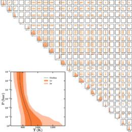 A corner plot illustrating the results of an atmosphere retrieval, here computing different abundances and atmospheric profiles fit to a combination of the Tiberius output and Hubble data. [Constantinou et al. 2023]