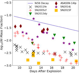The inferred nickel abundance over time for several real supernovae. The expected decay rate is shown in the solid line. [Chen et al. 2024]