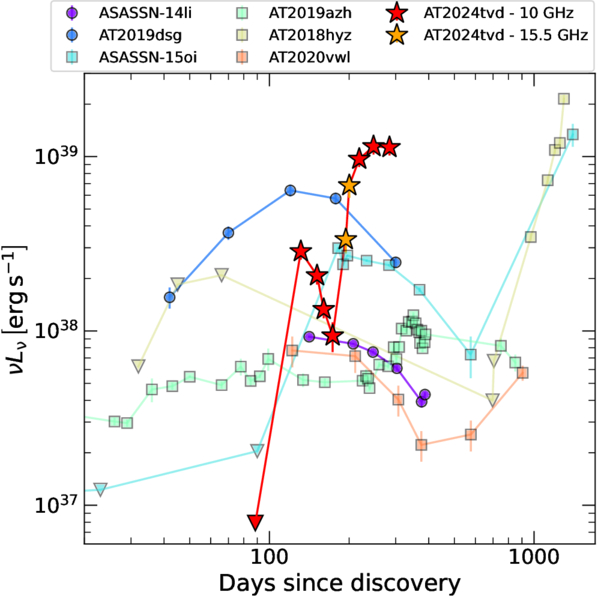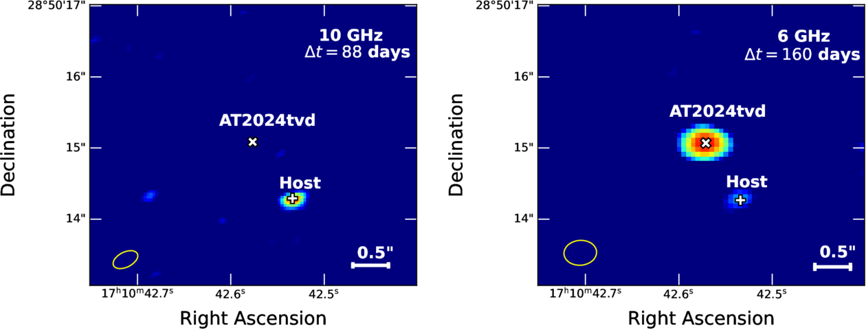 Less than three months after AT 2024tvd was discovered, Itai Sfaradi (University of California, Berkeley) and collaborators launched a months-long radio-wavelength observing campaign using the Very Large Array, the Atacama Large Millimeter/submillimeter Array, the Arcminute Microkelvin Imager Large Array, the Allen Telescope Array, and the Submillimeter Array. Radio observations are critical for investigating jets and outflows from tidal disruption events.