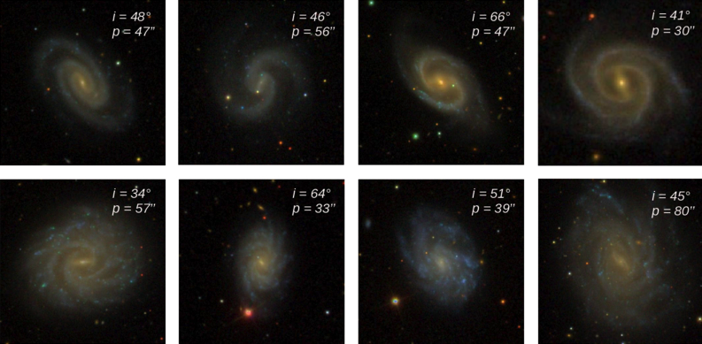 Displayed above are eight galaxies imaged by the Sloan Digital Sky Survey. Although all of these galaxies are spiral galaxies, there are large differences between them: the top row shows grand-design spirals, which feature well-defined arms, and the bottom row shows flocculent spirals, which have feathery or patchy arms. Recently, a team led by Biju Saha (Indian Institute of Science, Education and Research) explored whether grand-design and flocculent spirals could be classified by their fractal dimension. With intricate structures on scales large and small, spiral galaxies are fractal-like, and fractal dimension is a way of quantifying the complexity of their structure. Saha and collaborators found a statistically significant difference in the median fractal dimension of their samples of grand-design and flocculent spirals, suggesting that this mathematical method can help distinguish between the two types of spirals. To learn more about how fractal dimension is calculated from galaxy images, and what these results might mean for how spiral arms form, be sure to check out the full research article linked below.