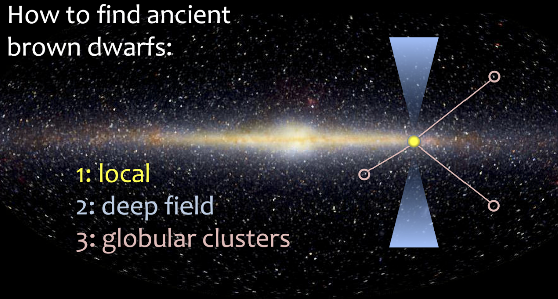 Three complementary approaches to identifying ancient brown dwarfs in the Milky Way: nearby local samples selected by kinematics, deep-field observations that probe distant populations, and brown dwarfs in old globular clusters. [Adam Burgasser, Cool Star Lab]