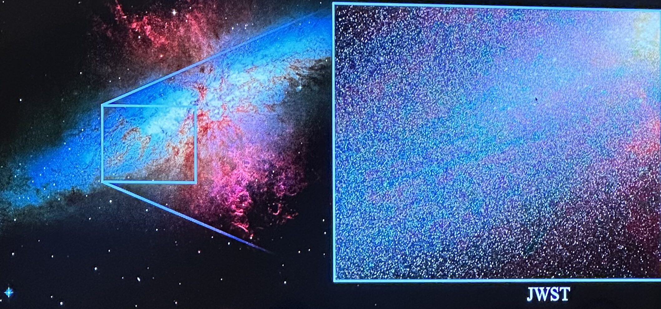 Adam Smercina (STScI) presented a new JWST imaging survey of the nearby starburst galaxy Messier 82 (M82). M82 is forming stars at roughly 10 times the Milky Way’s total rate, but heavy dust has long made it difficult to reconstruct its detailed star formation history. With JWST’s sensitivity and resolution, the team can now resolve individual stars across the system, including about 16.5 million stars across the face of M82, enabling a much more direct, population-by-population view of when and where stars formed during the starburst.