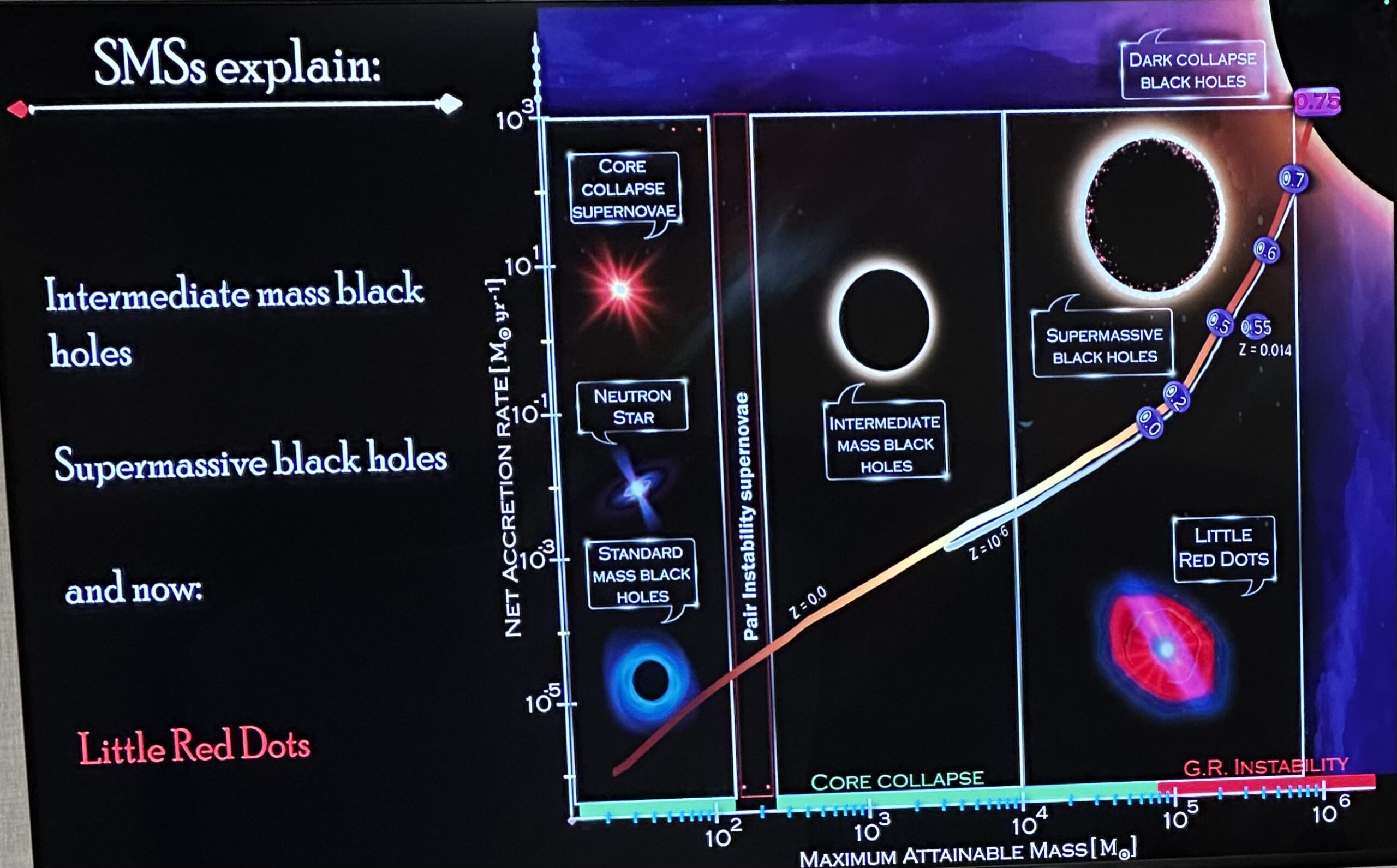 Devesh Nandal (Center for Astrophysics | Harvard & Smithsonian) proposed an alternative explanation for at least some little red dots: instead of being compact galaxies powered by active black holes, their light might come mainly from a single, extremely massive star growing through rapid accretion. A key motivation for this idea is what these objects don’t show: they lack detectable X-ray emission, which would normally be expected if an actively accreting black hole were present. At the same time, their very compact unresolved appearance makes them hard to explain as normal galaxies, and their spectra do not look like those of typical stellar populations either. In this picture, a supermassive star forms out of nearly pristine gas and accretes fast to push past the limits of classical stellar evolution. As long as the accretion rate stays above a critical threshold, the star remains bloated and relatively cool, giving it a red appearance even as it continues to gain mass. In theory, such a star could grow to around a million times the mass of the Sun before becoming unstable and collapsing directly into a black hole, offering a natural route to forming massive black hole seeds.