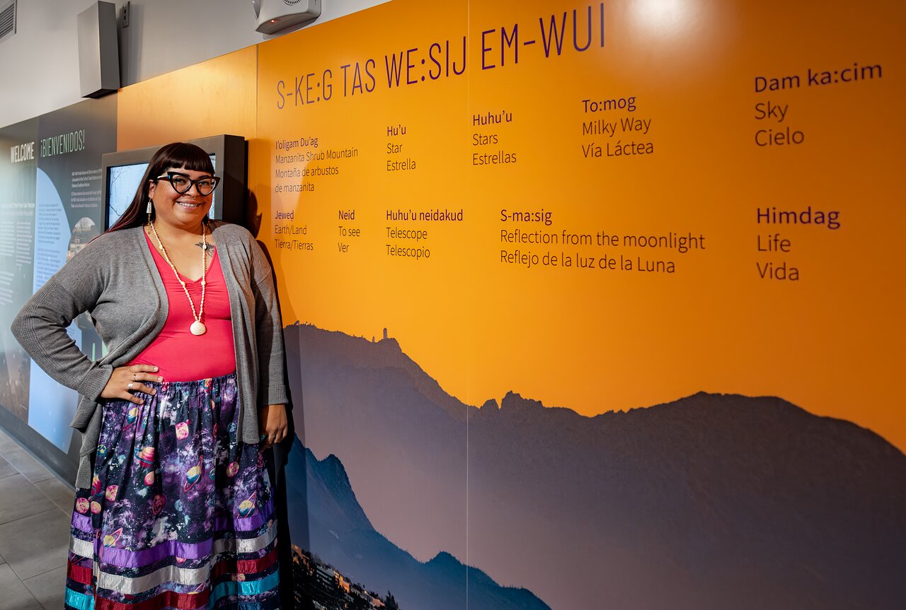 The Windows On the Universe Center’s lobby exhibit displaying the Tohono O’odham language with words describing the land and astronomy. Jacelle Ramon-Sauberan, the Tohono O’odham Nation Education Liaison, is seen to the left. [KPNO/NOIRLab/NSF/AURA/R. Proctor; CC BY 4.0]