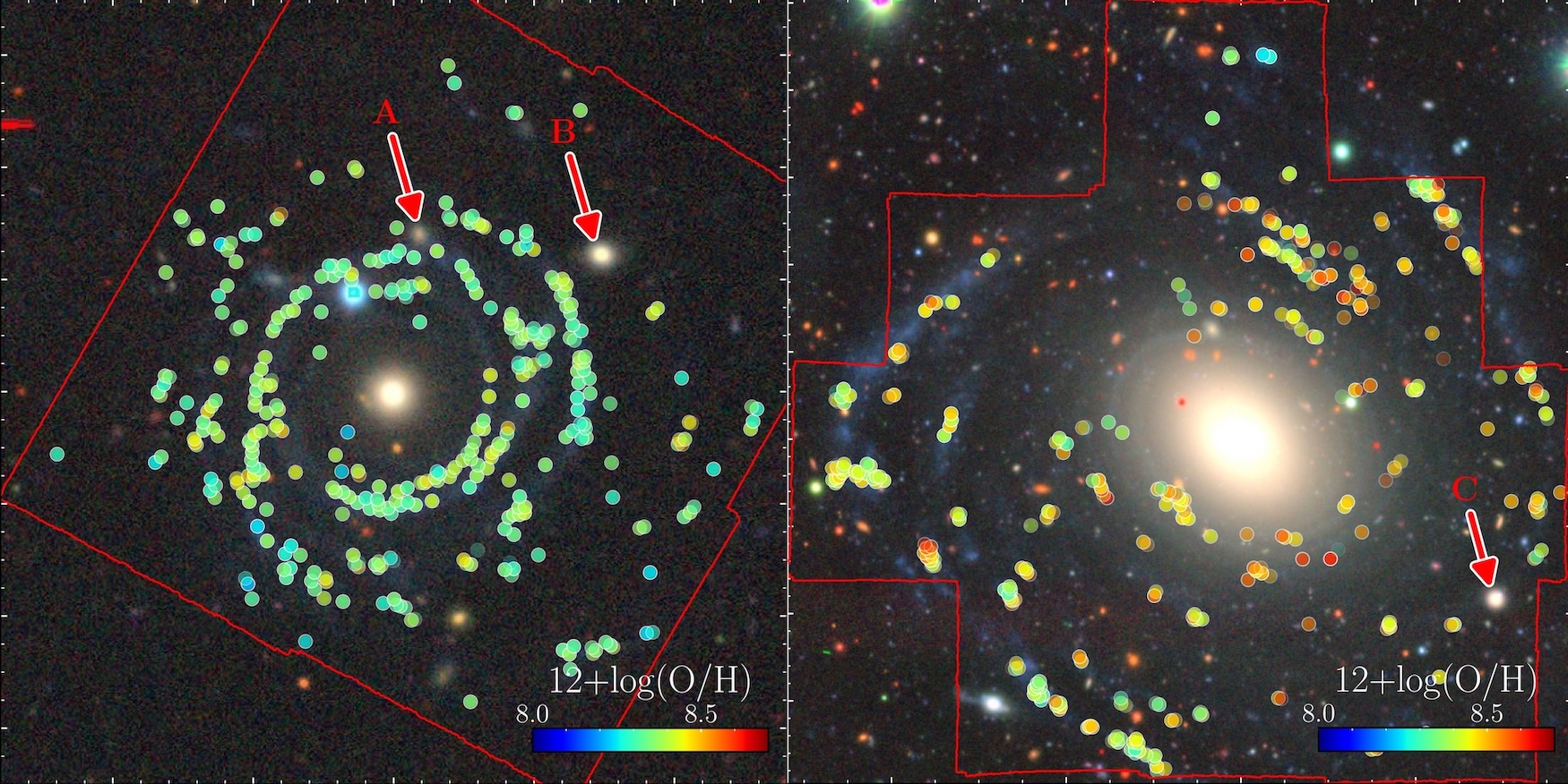 Giant low-surface-brightness galaxies are rare and unusual members of the galactic menagerie. They host the largest galactic disks currently known, have baryonic masses of order 100 billion solar masses, and sport narrow, tightly wound spiral structures. The origins of these vast galaxies — they can be up to 10 times larger than the Milky Way — are unknown, though various theories involving mergers, accretion, and strange dark matter halos exist. Research also suggests that there may be a connection between these galaxies and compact ellipticals, which are small, dense, and contain old stars. In a recent article, a team led by Anna Saburova (Sternberg Astronomical Institute) investigated two giant low-surface-brightness galaxies with compact elliptical companions. In the image above, the colored circles represent the oxygen abundance at each location in AGC 192040 (left) and UGC 1382 (right). The red arrows point to the compact elliptical companions. Using the chemical abundance information to investigate possible formation mechanisms, Saburova and collaborators found that the two galaxies likely formed in different ways. UGC 1382 appears to be the result of multiple mergers, while AGC 192040 may have accreted gas from its halo or a galactic filament before undergoing a merger of its own. To learn more about this study of two rare galaxies, be sure to check out the full research article linked below!