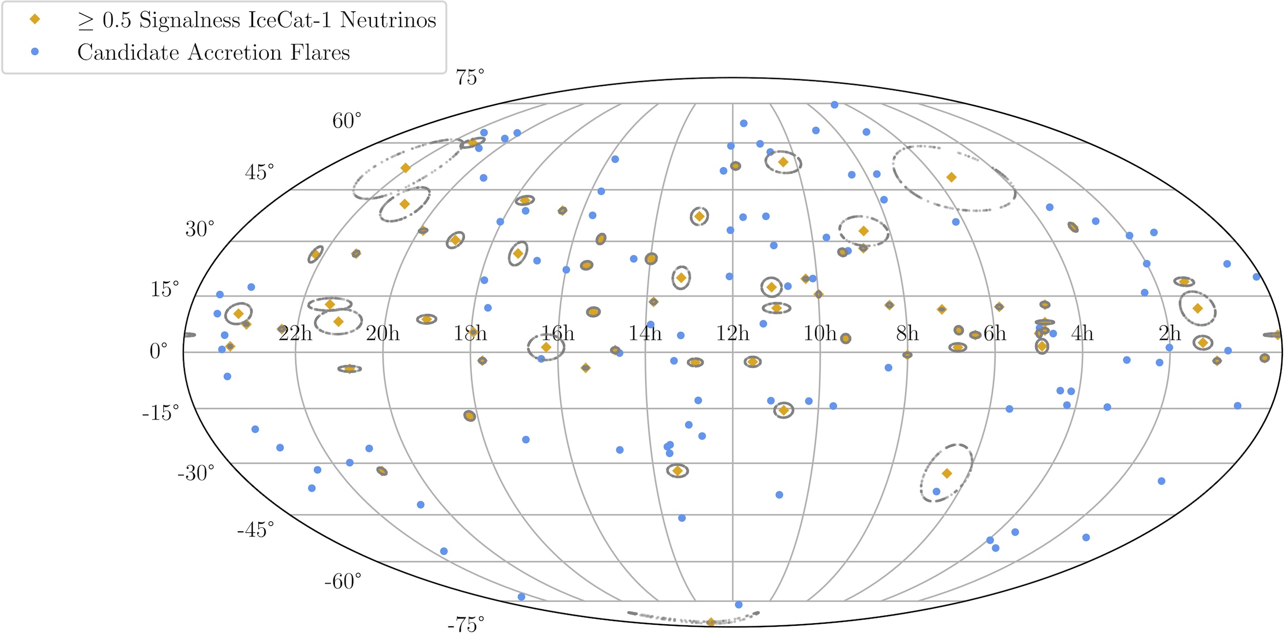 For a flare and a neutrino to be considered spatially and temporally coincident, the neutrino must arrive within one year of the flare, and the flare must fall within the 90% certainty contours of the neutrino. Ultimately, Wang’s team found no neutrinos that fulfilled both criteria and only one that was spatially but not temporally coincident with a black hole flare.