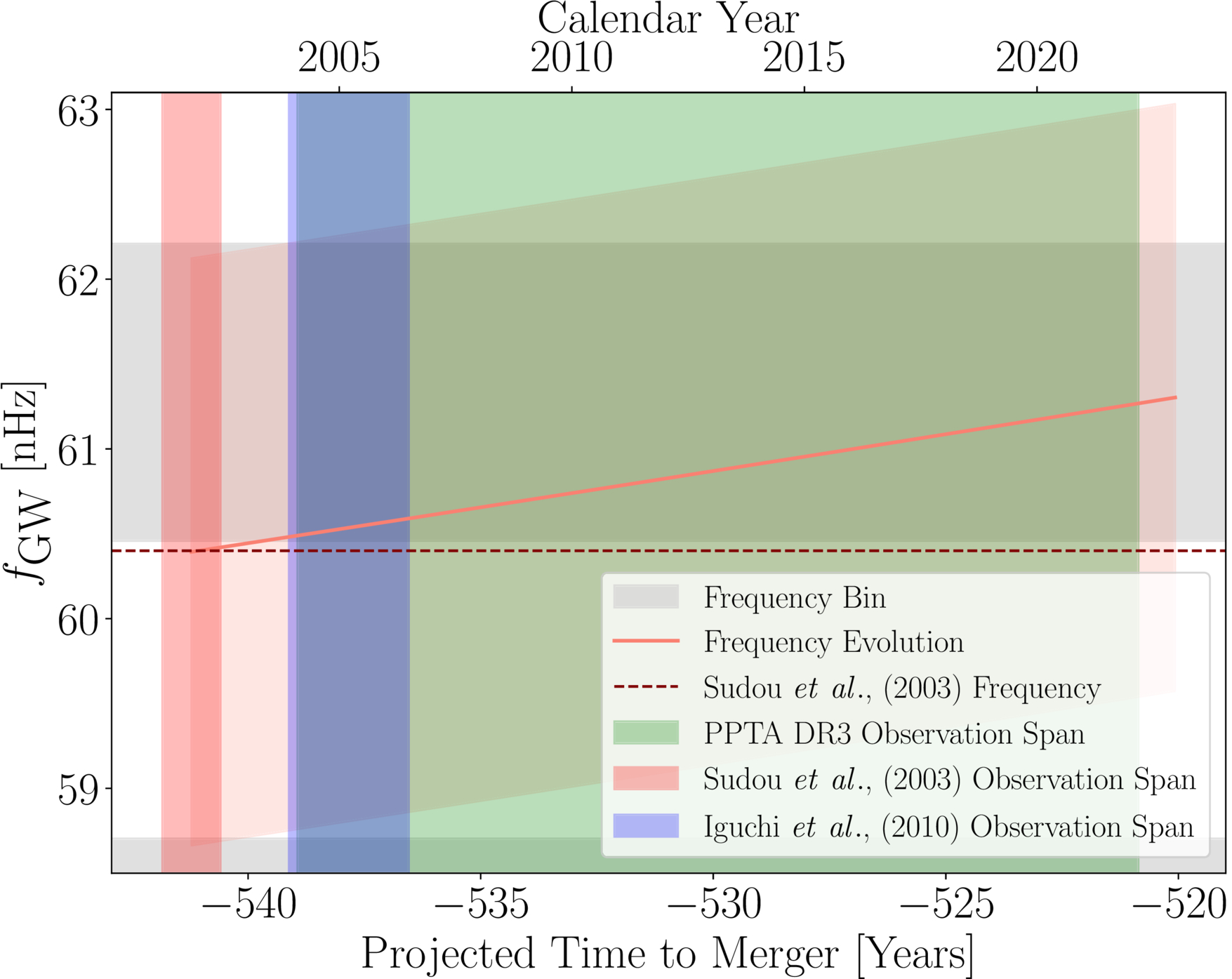 The predicted frequency evolution of gravitational waves from the black hole binary candidate in 3C 66B. Click to enlarge. [Cardinal Tremblay et al. 2026]