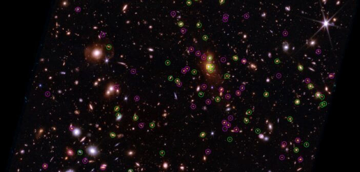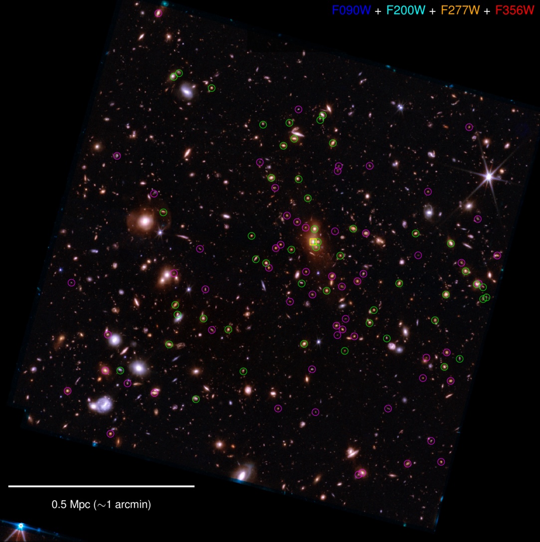 This image from JWST shows the galaxy cluster XLSSU J021744.1-034536. The cluster is at a redshift of z = 1.98, placing it at cosmic noon, when the universe’s star formation was at its peak. To study the formation and evolution of this cluster, Zachary Scofield (Yonsei University) and collaborators collected wide-ranging clues, including signs of weak gravitational lensing, the glow of gas in between the galaxies of the cluster, and an analysis of the cluster members. The image above (click for the full view) indicates the galaxies that are members of the cluster. The brightest galaxy in the cluster is marked with a yellow square, and the remaining cluster members are circled, with the color indicating whether the galaxy’s cluster membership was assigned photometrically (magenta) or spectroscopically (green). Combining all available lines of evidence, Scofield’s team found that XLSSU J021744.1-034536 is undergoing a merger, giving a rare glimpse into this stage of cluster formation. To learn more about this work and what it tells us about galaxy clusters at cosmic noon, be sure to check out the full article linked below.