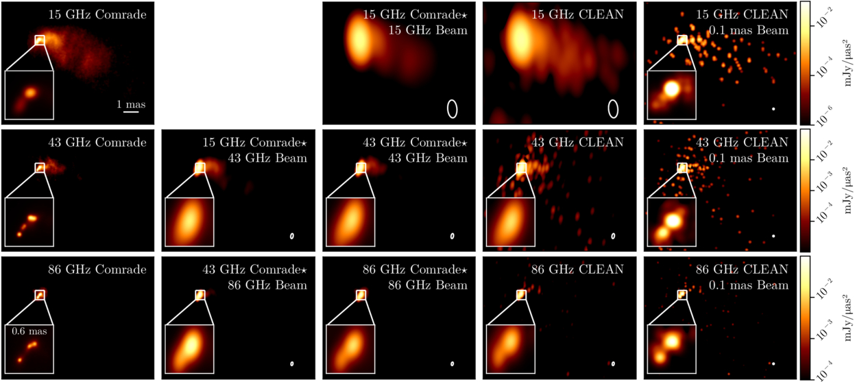 A comparison of the new HIBI technique (referred to as “Comrade” here) and a traditional algorithm called CLEAN. Click to enlarge. [Tiede et al. 2026]