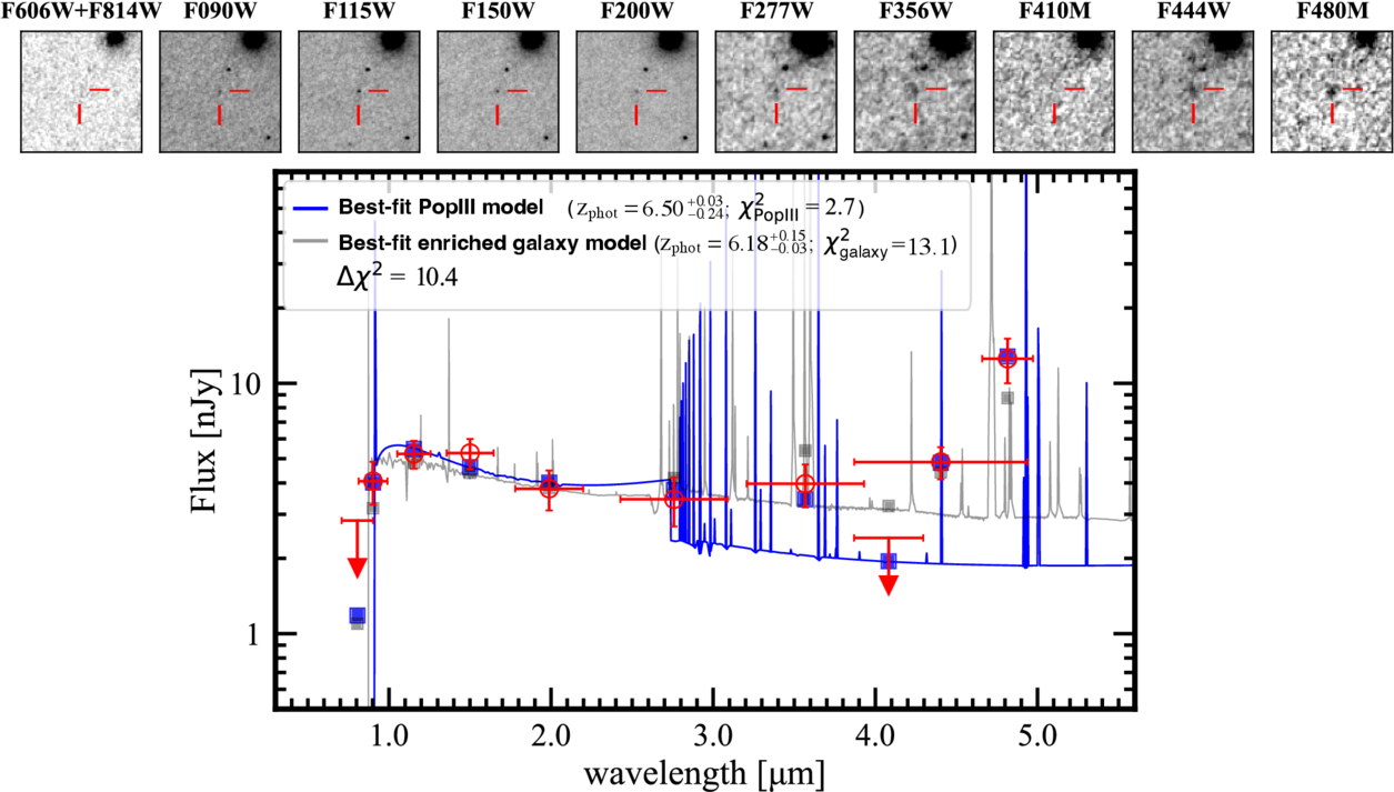 Figure 2: SED of GLIMPSE-16043 with the best-fit Pop III template (blue) and best-fit metal-enriched template (gray). The top panel is the galaxy imaged in different filters from NIRCam and the Hubble Space Telescope. [Fujimoto et al. 2025]