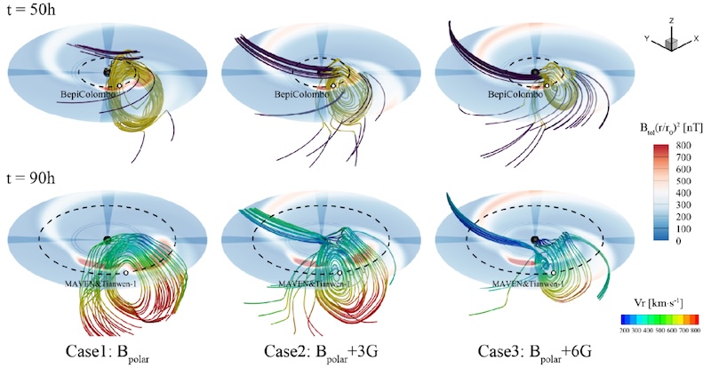 Simulation results showing how the propagation and expansion of a CME are affected by the polar magnetic field strength. Click to enlarge. [Zhang et al. 2026]