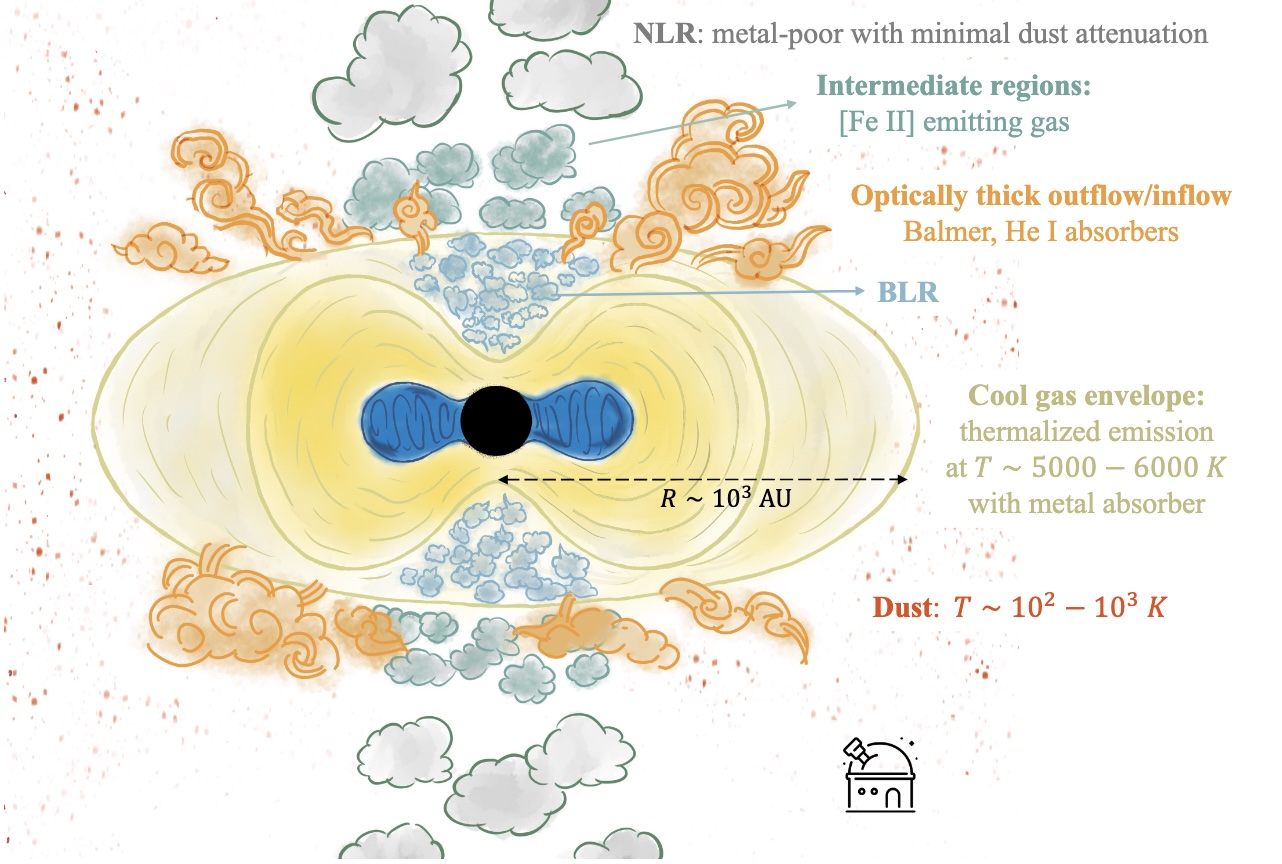 Figure 1: A schematic showing the authors’ interpretation of the nature of LRDs. This scenario is built up based on spectroscopic observations from several ground-based telescopes. Although the local sources differ slightly from the ones in the early universe, this model is strikingly similar to the ones invoked to explain some of the most extreme LRDs. The fact that such objects exist in the nearby universe is intriguing and raises further questions as to how black holes enter such a phase. [Lin et al., in press]