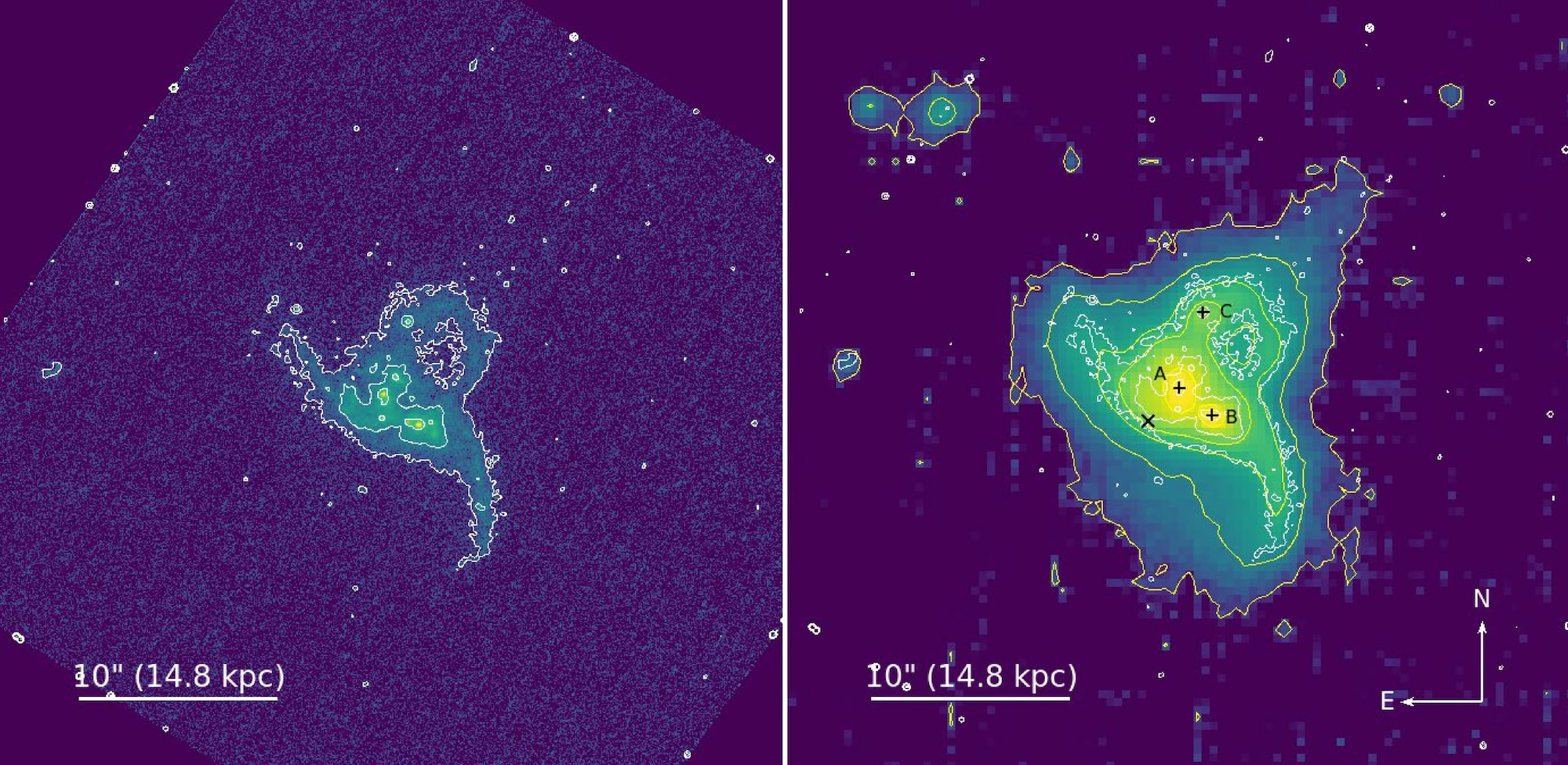 Additionally, the authors’ star cluster age distribution for the group (see Figure 2) has a second, broader peak of higher-mass clusters with ages around 200 million years. This would correspond to when the most recent encounter between NGC 7320C (which has now passed through the group and is out of frame in Figure 1) and NGC 7319 is estimated to have occurred.