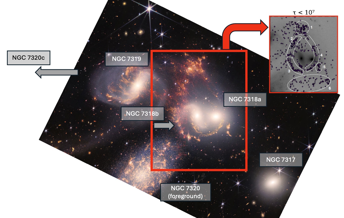 Figure 1: The JWST imaging of Stephan’s Quintet with member galaxies labeled (including NGC 7320C, which is outside of the field of view). Gray arrows indicate the direction the associated galaxy is moving. The inlaid image shows the distribution of young star clusters in relation to the six main tidal features in the group. [Inset image: Adapted from Aromal et al. 2025; Background image: NASA, ESA, CSA, STScI]